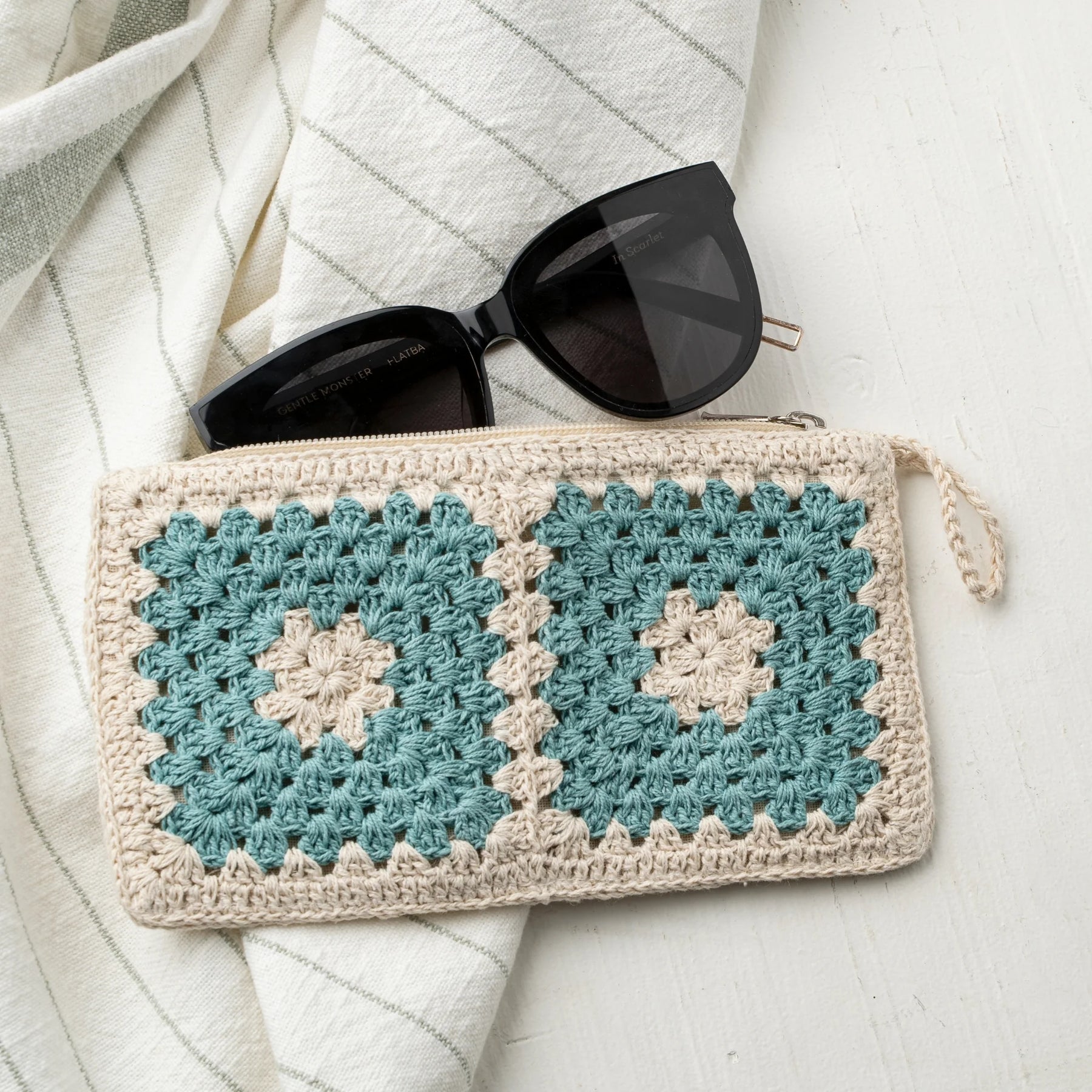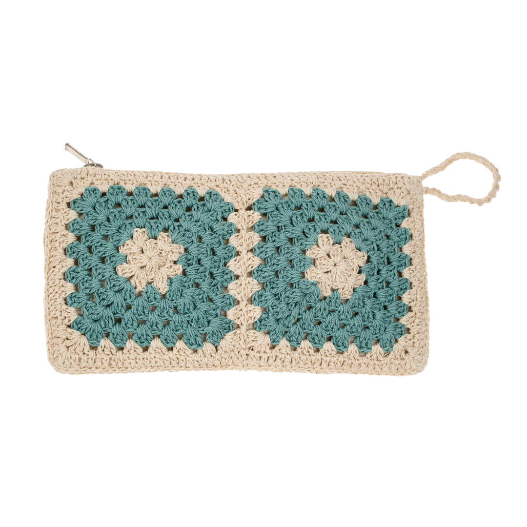 Perfect for holding sunglasses and other purse essentials, the Luna Crochet Pouch is handcrafted in India and features crocheted pattern on the front, textural plain cotton on the reverse, and a tone-on-tone zip.