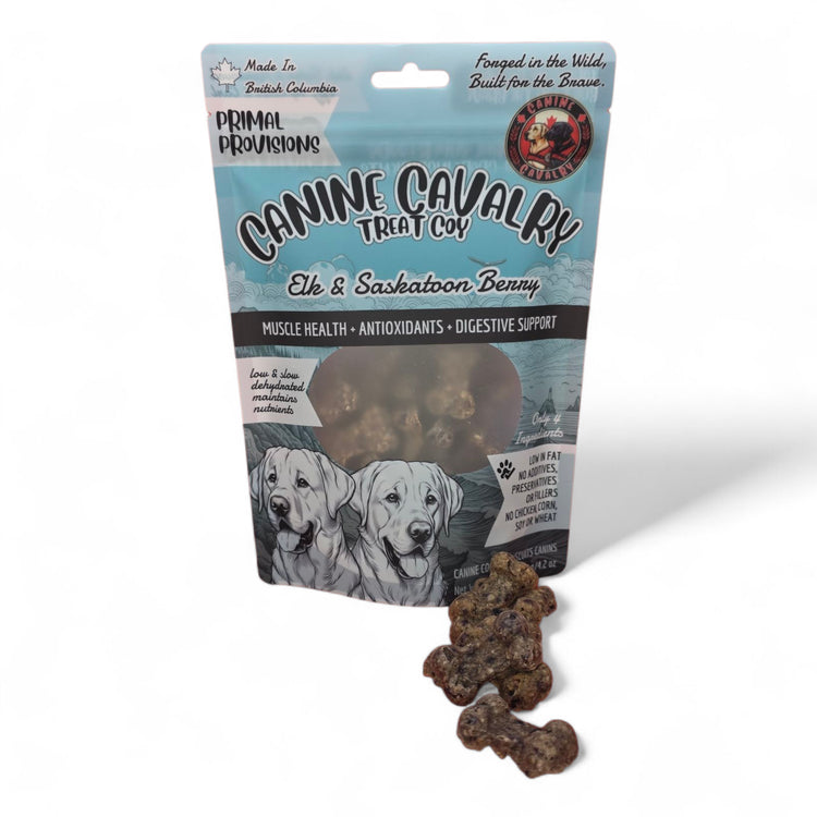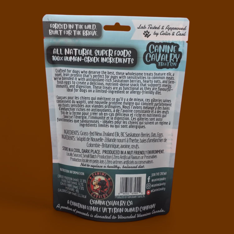 Treat your dog to a taste of the wild with our Elk & Saskatoon Berry treats—crafted to support strong muscles, healthy digestion, and a shiny coat. Inspired by the natural bounty of the Canadian wilderness, these flavourful bites are packed with the goodness your pup needs to thrive!