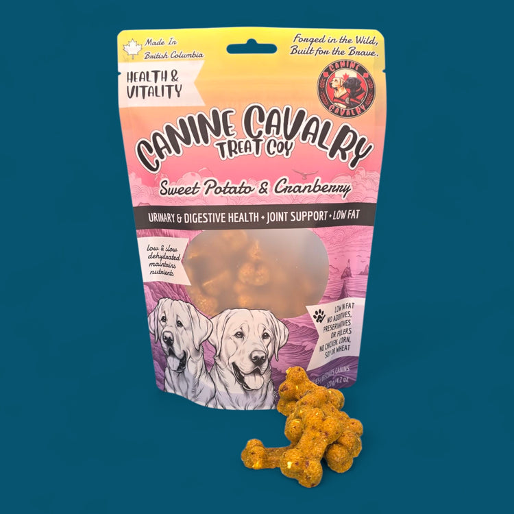 Treat your dog to our Sweet Potato & Cranberry Dog Treats — a delicious and functional snack crafted to support digestion, joint health, and fresh breath. Sweet potato offers fibre and beta-carotene for gut and skin health, cranberries are rich in antioxidants and support urinary health, turmeric helps ease inflammation, and parsley naturally freshens breath. These flavourful treats are a simple way to nourish your dog with every bite.